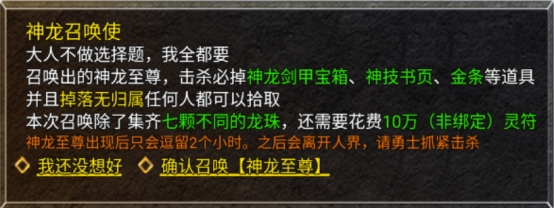 集齐7颗龙珠后,可在行会领地中找到神龙召唤使召唤神龙至尊。召唤时可根据需求通过许愿选择不同奖励类型的神龙至尊。若追求最高奖励,建议选择 “我全都要”选项,此项将触发顶级奖励掉落,但需召唤者个人额外消耗10万灵符,请玩家根据自身资源情况谨慎决定。召唤成功后,发起召唤的玩家将获得限时专属称号 “超级赛亚人”。请注意:神龙至尊仅存在2小时,请行会成员尽快组织击杀。另外需特别注意的是:神龙至尊掉落的所有物品均为行会共享归属,行会全体成员均可自由拾取,建议提前协调分配方式,避免争抢遗漏。