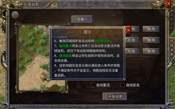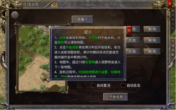 不仅如此,在线巡航还具备自动复活和自动反击两大实用功能。当角色在战斗中不幸死亡后,能够自动安全复活,并迅速继续投入到挂机战斗中,前往下一张巡航地图继续刷怪,无需玩家手动干预,确保巡航过程不间断。自动反击功能则让角色在挂机过程中,当受到其他玩家攻击时,能够自动进行反击,有效保护自身安全,避免被恶意玩家持续骚扰,保障了挂机的稳定性和安全性。