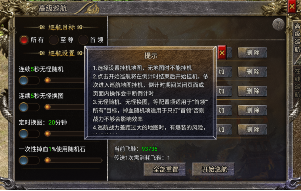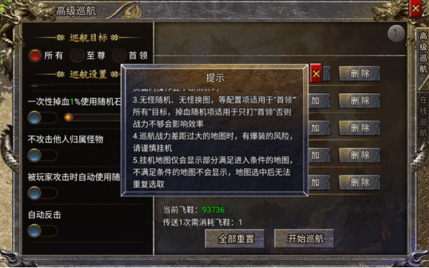 丰富的高级巡航设置:高级巡航解锁了更多细致入微的巡航设置选项。玩家可以自行设定多少秒无怪时随机或换图,避免在无怪区域浪费时间;定时换图功能则让玩家可以按照自己的计划,在不同时间段切换到不同地图;不攻击他人归属功能,可避免帮别人耗血而浪费不必要的时间;自选巡航目标功能更是让玩家能够精准定位自己想要攻击的怪物,提高刷怪效率,满足玩家个性化的游戏需求。