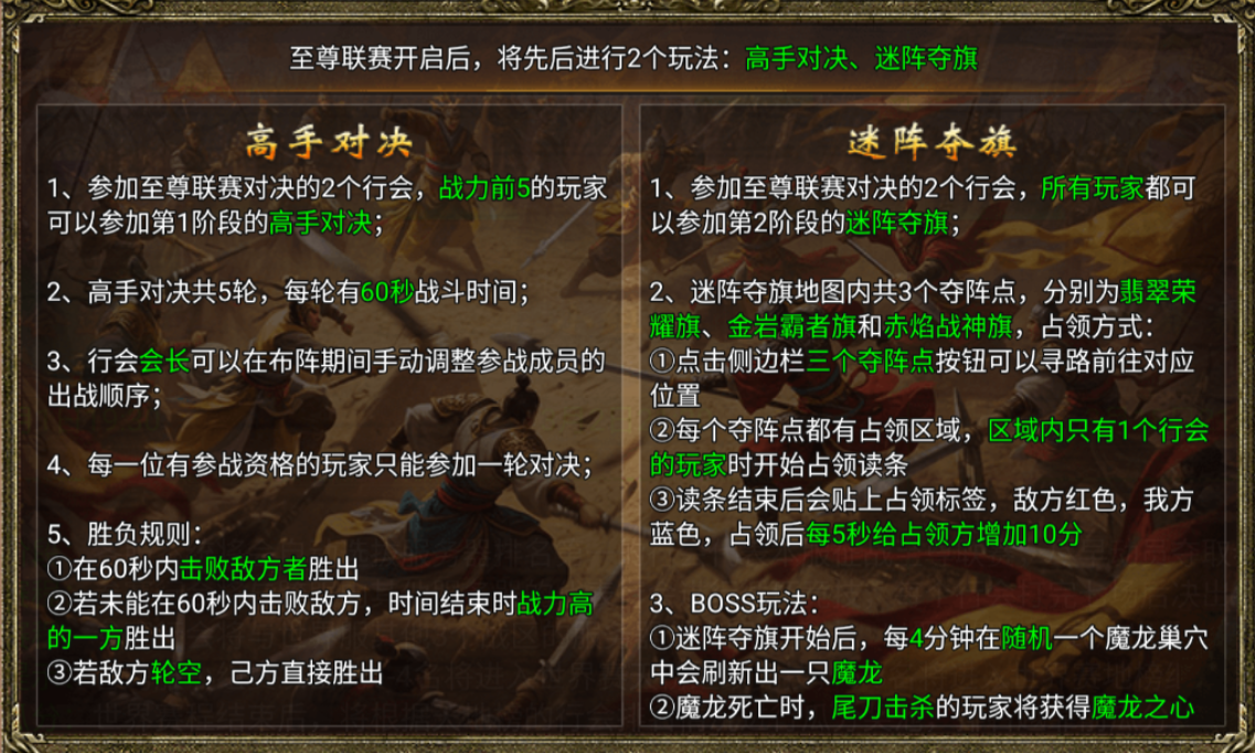 参与至尊联赛对决的两个行会,战力前5的玩家将参与第一阶段的高手对决,高手对决共五轮,每轮60秒战斗时间,行会会长在布阵期间可以手动调整出战次序,高手对决每位玩家只能参与一轮对决。