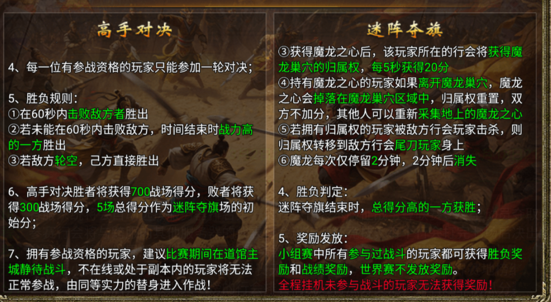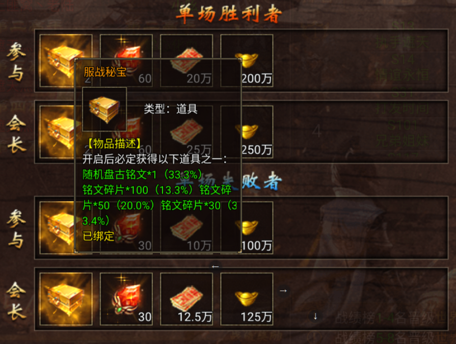 2.60秒内未分出胜负,视战力高的为胜者。每场比赛参与者均有服战秘宝(有概率的盘古铭文,较大概率得铭文碎片)奖励。