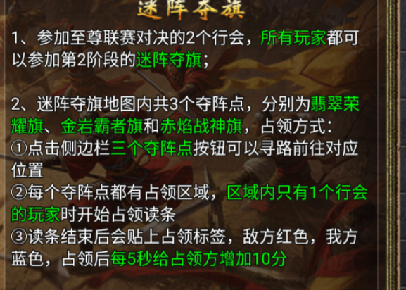 迷阵夺旗则是全行会的人都可以参与,将以高手对决的积分做为夺旗的初始积分,迷阵迷阵夺旗地图内共3个夺阵点。